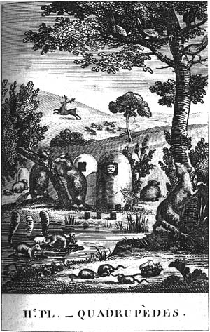 Sur l'avant-scène, un rat, sur le dos et tenant des provisions entre ses pattes est traîné par d'autres rats. A droite, un renard éblouit des poules par ses mouvemens ; à gauche, des castors établissent leurs cabanes sur pilotis ; dans le fond, traverse un cerf poursuivi par une meute de chiens. |