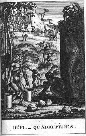 Des singes pillent un jardin, gardés par une sentinelle, le bâton sur l'épaule. Un orang-outang, qui revient de la fontaine, met bas ses seaux pour prendre sa part du butin, Au loin, sur une montagne, d'autres singes combattent avec courage contre des marins qui leur tirent des coups de fusil. |
