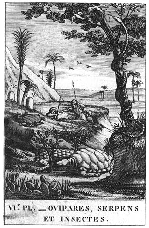 La caouane attaque le crocodile engagé dans un chemin creux ; sur un plan plus éloigné, des chasseurs courent vers une tortue qu'ils ont renversée sur le dos; sur la droite, un boiga, couvrant le tronc d'un arbre de ses nombreux replis, fait la chasse aux oiseaux qui habitent ses branches. |