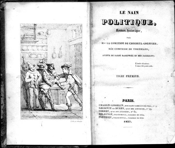 Comtesse de Choiseul-Gouffier, Le Nain politique, 1827 Titre et frontispice | frontispice I | frontispice II | frontispice III | introduction | pages 1, 2 et 3 du roman