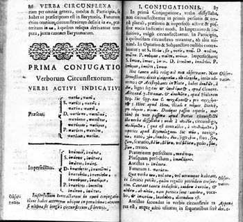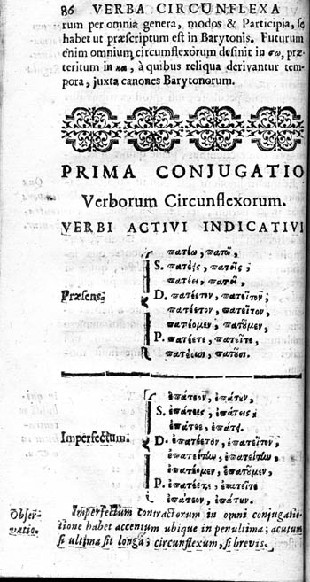 Nicolas Clénard, Grammatica Graeca, 1701 Titre détail vignette | reliure | pages I | IV privilège | V | 86-87 86 | 163 | 164 | 216