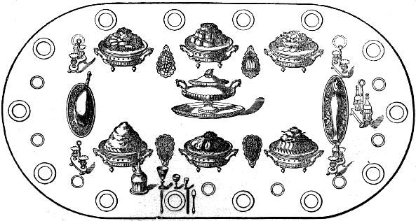 Un potage, six entrées, deux hors-d'oeuvre chauds, quatre hors-d'oeuvre froids, un huilier