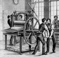 Presse à satiner : un paquet de feuilles passe entre les cylindres de la machine