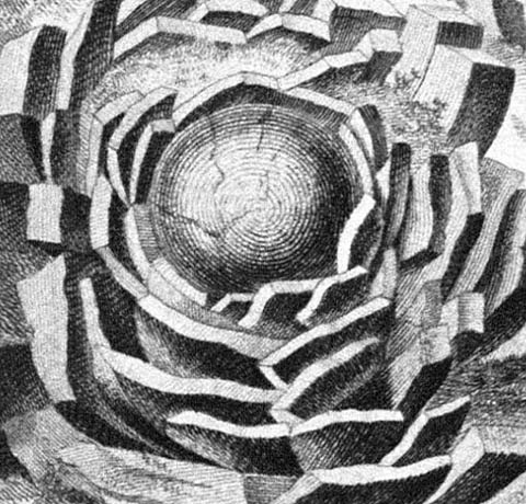 Faujas de Saint-Fond, Minéralogie des volcans, 1784 Butte d'Ardenne, près de Pradelle avec une boule de basalte remarquable dans le massif de cette roche volcanique : détail |