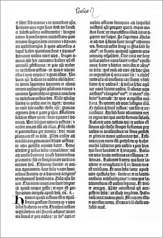 Bible dite aussi "à 42 lignes" (parce son texte est composé en 2 colonnes de 42 lignes). Cette Bible serait le premier livre imprimé en caractères mobiles. détail
