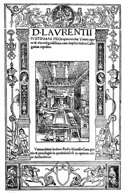 Titre encadré avec la marque de l'imprimeur Josse Bade représentant son atelier