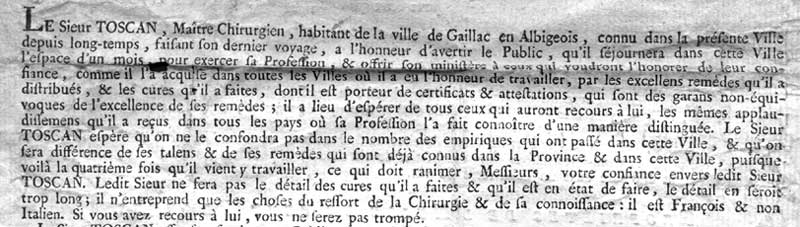 du Docteur Toscan, maître chirurgien de Gaillac, de passage à Tarbes