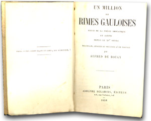 Alfred de Bougy, Un million de rimes gauloises. Fleur de la poésie drolatique et badine depuis le XVe siècle recueillie, annotée et précédée d'une préface par Alfred de Bougy. Paris, Adolphe Delahays, éditeur, 4-6 rue Voltaire, 1858. In-16, XII, 560 p.