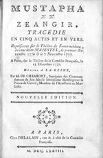 M. de Chamfort, Mustapha et Zeangir. Tragédie en cinq actes et en vers. Représentée sur le Théâtre de Fontainebleau devant leurs Majestés, le premier Novembre 1776 et le 7 Novembre 1777. A Paris, sur le Théâtre de la Comédie Française, le 15 Décembre 1777. Dédiée à la Reine. Par M. de Chamfort, Secrétaire des Commandemens de son Altesse Sérénissime Monseigneur le Prince de Condé, Membre de l'Académie de Marseille. Nouvelle Edition. A Paris, Chez Delalain, rue & à côté de la Comédie Françoise, 1778