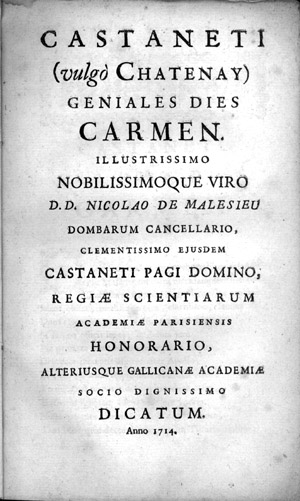 | Bibliophilie | Page d'accueil. Home page | Adhésion Castaneti (vulgo Chatenay) Geniales Dies Carmen, 1714 titre| première page| dernière page