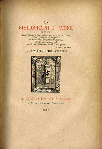 (Antoine Laporte,) La Bibliographie jaune, 1880. Couverture Titre détails 1 2 avec la belle devise qui pourrait être la nôtre : "à la porte qui méprise les vieux livres"