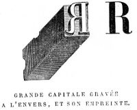 grandes ou petites sont - et vous savez maintenant pourquoi - gravées à l'envers. Ainsi vous voyez représentée ici la lettre R (majuscule), sculptée en relief sur un petit bloc, la queue et la boucle dirigées vers la gauche ;