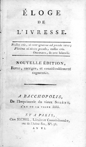 250 pp. Titre . Frontispice de Binet . Avis de l'éditeur . Table . Catalogue du libraire L'Eloge de l'ivresse de Sallengre parut pour la première fois chez Pierre Gosse en 1714 et fut souvent réédité (3 fois en 1715, en 1720 et en 1734). Nous présentons ici l'édition de Michet qui a complètement remanié le texte et en a fait un nouvel ouvrage (comme l'éditeur le signale dans sa préface). Le frontispice fut composé par Binet et gravé par Le Roy. Georges Vicaire (Bibliographie gastronomique, 1890) signale par ailleurs deux autres livres portant ce titre, mais au contenu différent de notre Eloge, parus au XIXe siècle : - Eloge de l'ivresse, des buveurs et du jus de treille, suivi d'ivrigniana, recueil d'anecdotes bacchiques, Paris, Delarue, s. d. (vers 1830), in-16, collection "Petite bibliothèque Omnibus" - un autre ouvrage portant le même titre avec une mention d'auteur (Par Ana-Gramme Blismon), également chez Delarue, en 1857, dans la collection "Bibliothèque amusante. Elite des Ana" et donne comme auteur Blismon. Le catalogue témoigne de l'éclectisme teinté de l'esprit révolutionnaire de l'époque, du libraire-éditeur. On y trouve par exemple l'oeuvre du célèbre Meslier, un prêtre athée du XVIIIe siècle aux côtés des Chefs-d'oeuvre de Corneille.. |