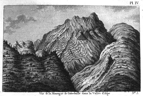 Essai sur la minéralogie des Monts-Pyrénées : Planche 1 | 2 | 3 | 4 | 5 | 6 | 7 Pl. IV : vue de la montagne de Gubedaille dans la vallée d'Aspes © Textes Rares