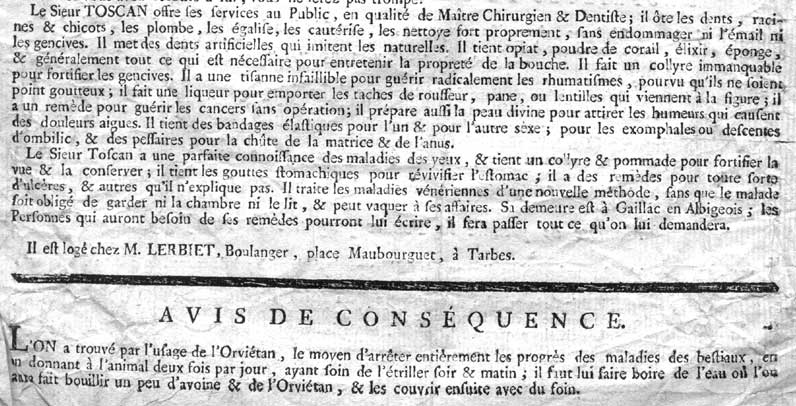 Prospectus du Docteur Toscan, maître chirurgien de Gaillac, de passage à Tarbes